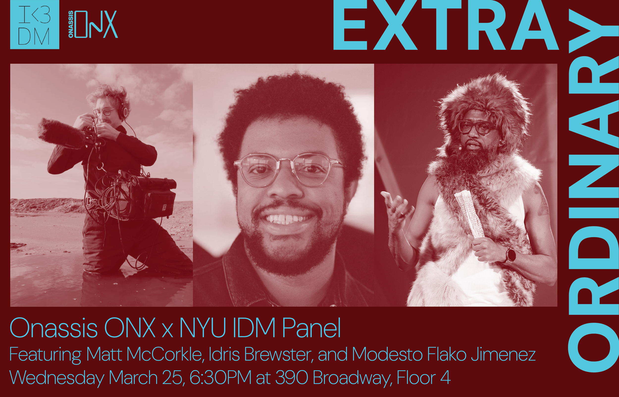 Craig Fahner and Elizabeth Henaff from NYU IDM in conversation with Onassis ONX members Idris Brewster, Matt McCorkle, and Modesto Flako Jimenez. The artists will each briefly introduce their work, followed by a moderated discussion on how their practice intersects with the Extra-Ordinary. Open discussion and Q&A with the audience to follow.