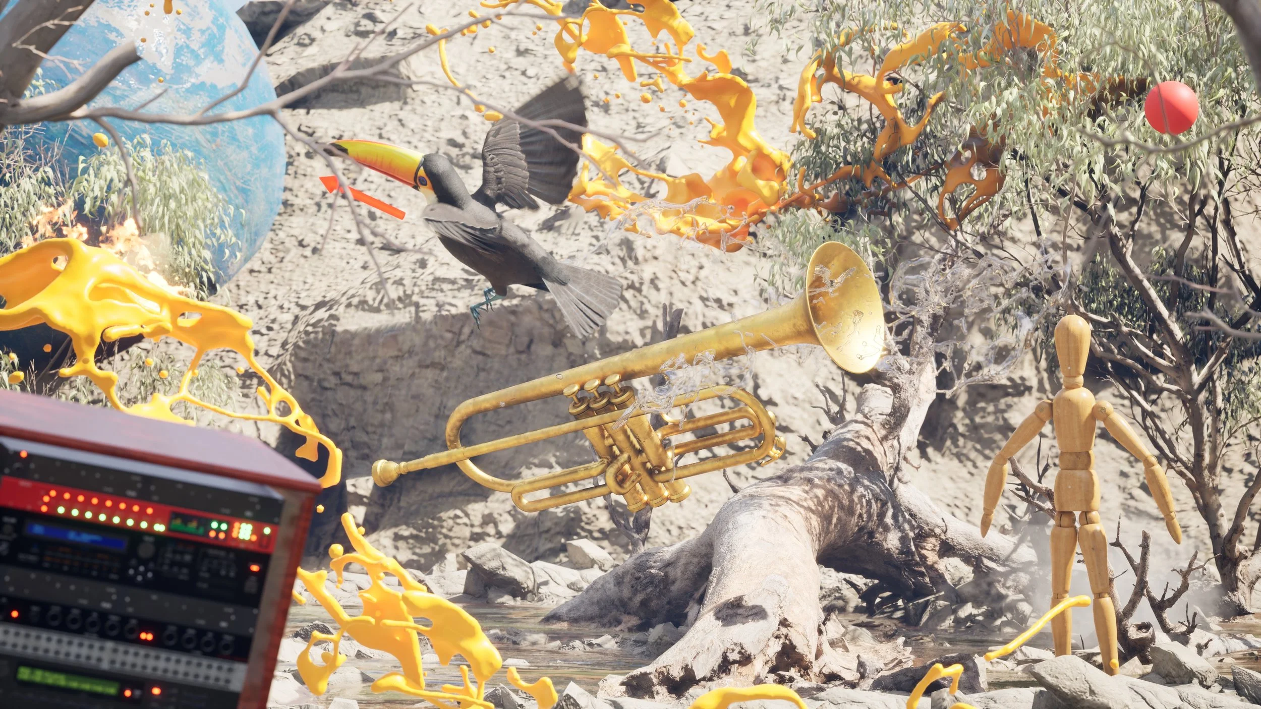 Homage to Jon Hassell is a kind of musical composition-as-software, conceived in tribute to the evocative sonic palette and conceptual worldbuilding of the late composer and performer. Drawing from the distinct harmonized trumpet and hazy pacing of Hassell’s recorded work, this project reframes real-time simulation as generative music in a virtual terrarium.