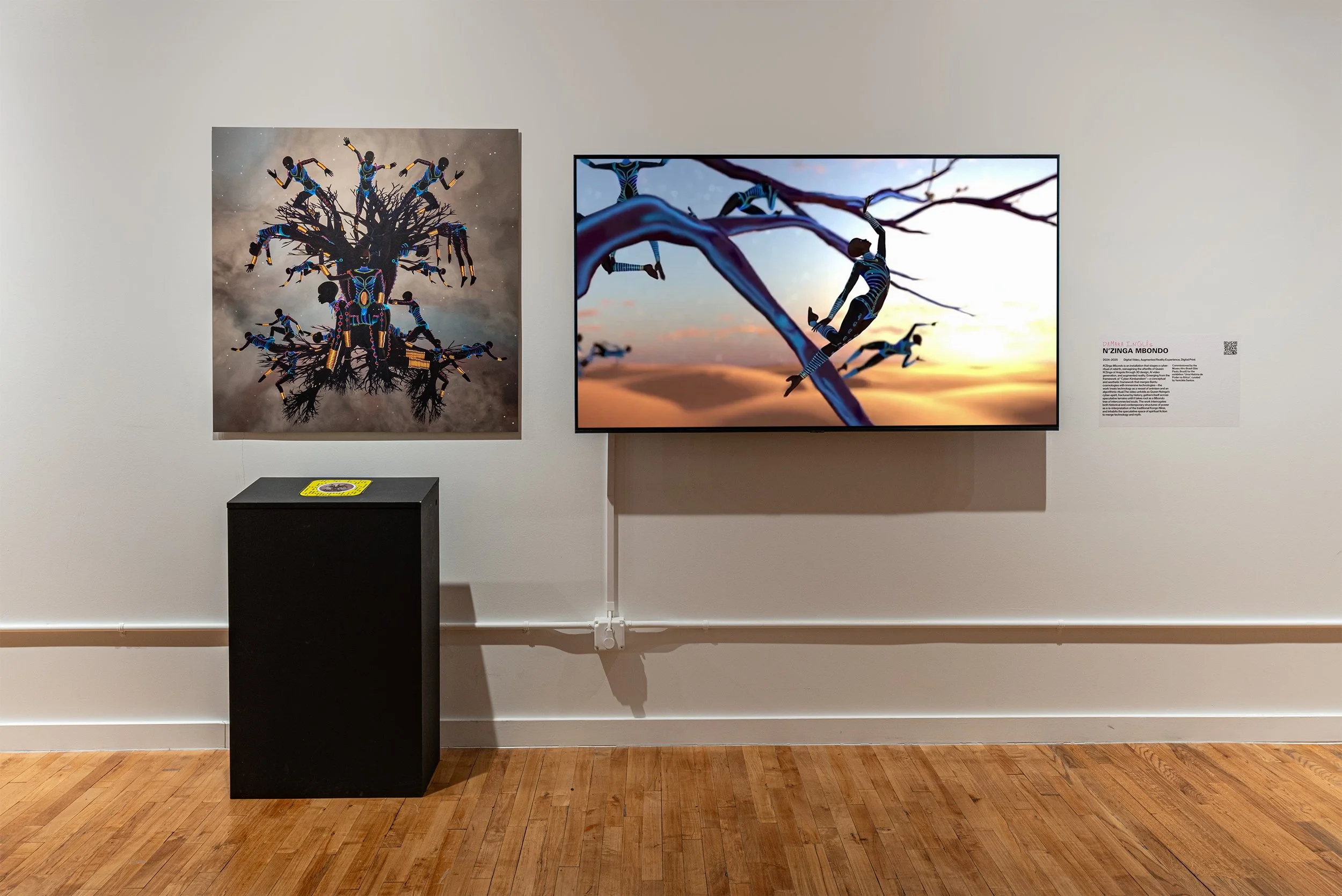 This installation reimagines the afterlife and transfiguration of Queen N’Zinga of Angola through AI-generated video, 3D imagery, and augmented-reality. In this cyber-spiritual fiction, the queen morphs into a spiritual organism that embodies an ancestral network of interconnected souls in the shape of an African Mbondo tree. Merging Bantu cosmologies with immersive technology, N’Zinga Mbondooperates as a ritual that ties individual fate to collective struggle through neoanimist symbology.